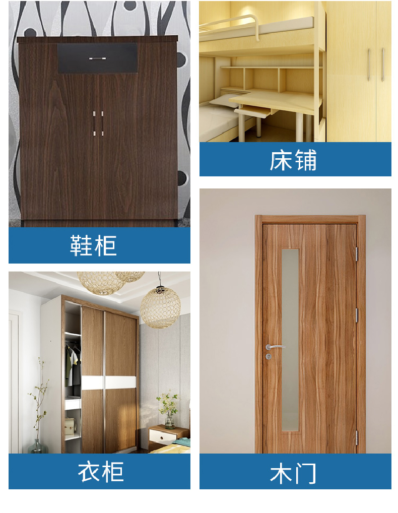 木纹膜产品纹路效果比较多,大致分为木纹系、石材系、金属系、纯色系、皮革系、布纹系。产品纹路样式有400多种,应用场景多样变化。对施工基层不挑剔。